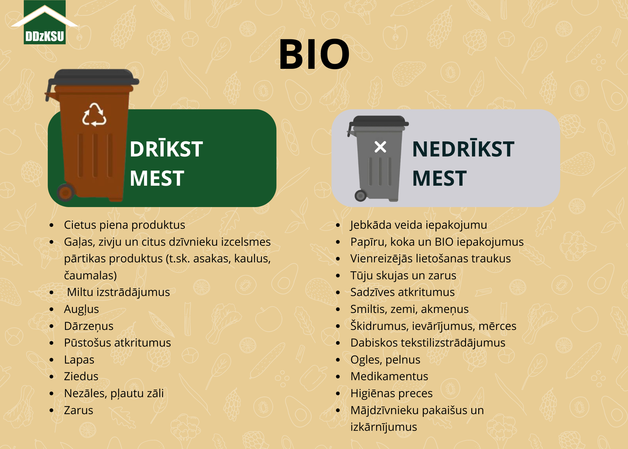 Bioloģiski noārdāmo atkritumu konteineri. Tajos drīkst izmest: ēdiena pārpalikumus, dārzeņu un augļu mizas, olu čaumalas, kaulus, asakas un citus bioloģiskos atkritumus. Bioloģisko atkritumu šķirošana ļauj samazināt atkritumu kopējo daudzumu un veicinātu komposta ražošanu.