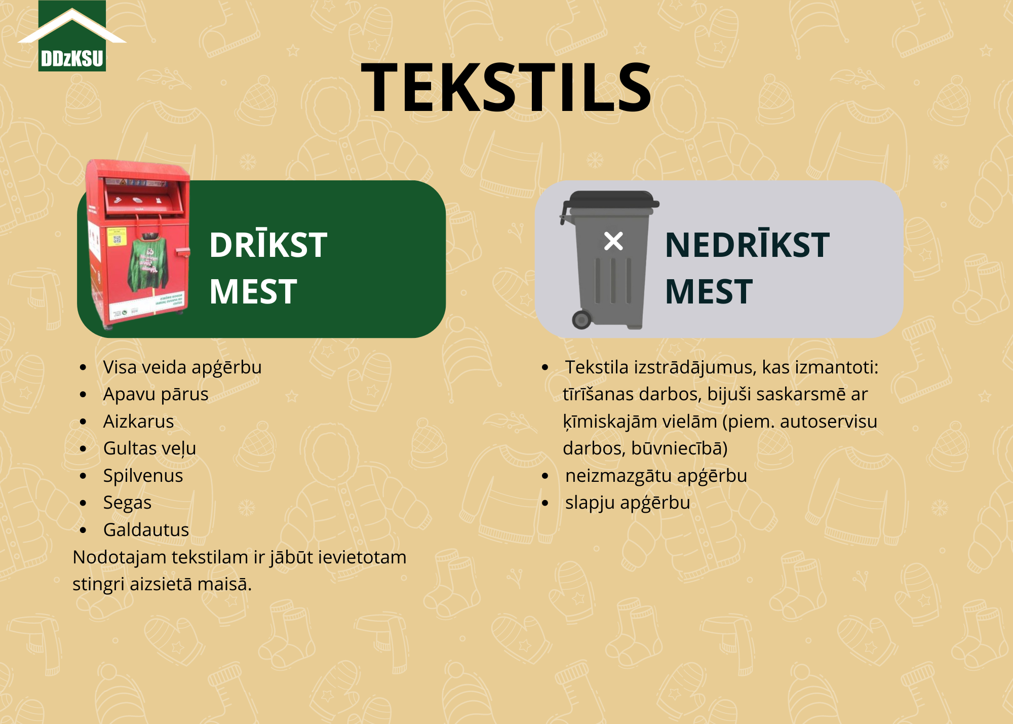 Tekstila šķirošanas konteineri pilsētā ir 18 un tajos var ievietot: apģērbus, apavus un mājas tekstilu, kas ir tīrs un vēl derīgs pārstrādei.