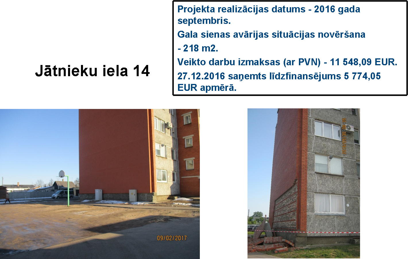 8) Daugavpils domes 2017.gada 14.decembra saistošajos noteikumos Nr.47 „Līdzfinansējums energoefektivitātes uzlabošanas pasākumu veikšanai daudzdzīvokļu dzīvojamās mājās” nosaka, ka pašvaldības līdzfinansējums dzīvojamās mājas gala sienu siltināšanas darbiem tiek piešķirts 30% apmērā no faktiskajām izmaksām, bet ne vairāk kā 35 eiro bez PVN par 1 m2